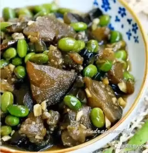 3、新鮮的毛豆很嫩,很容易熟,在燜煮過程中就可煮熟。也可以事先把毛豆焯熟,在茄子快出鍋時再把焯好的毛豆倒入鍋中一起炒入味