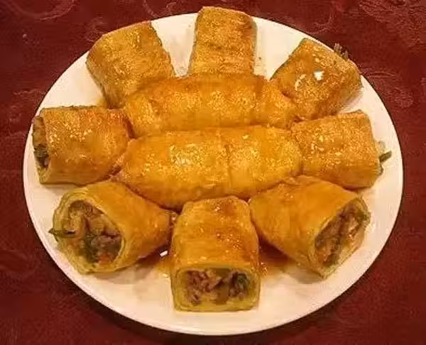 3、每一塊豆包展開,將1份餡料包卷,至於盤內蒸熟。
