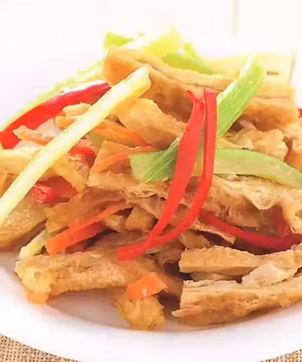 1、豆包洗凈;紅蘿蔔洗凈去皮;黑木耳洗凈去蒂;青椒洗凈去蒂及籽;均切成絲備用。