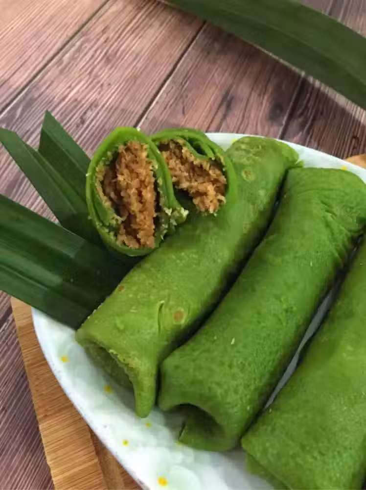 麵皮:麵粉150克、植物油1/2湯匙、木薯粉1湯匙、鹽1/4茶匙、椰漿1湯匙、雞蛋1個、煉奶1湯匙、斑斕葉8至10片加入325毫升清水榨汁。