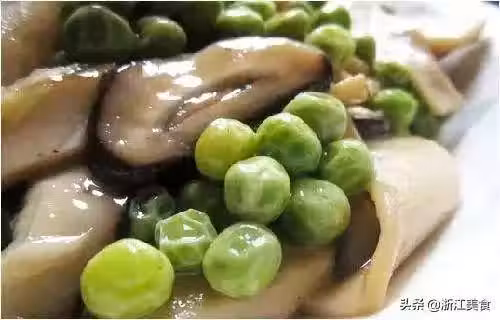 豌豆粒300g、干香菇8朵、花椒粉3g、鹽5g、味精3g、水澱粉15ml、色拉油適量、紅尖椒粒適量。