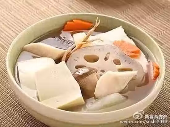食材:蓮藕60克、馬鈴薯40克、胡蘿蔔30克、豆腐40克、杏鮑菇80克、水800毫升、何首烏40克、人參須20克、茯苓2片、鹽1大匙