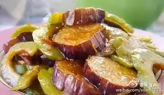 2、另起鍋熱油,爆香薑末、黃豆醬,加入半小碗水、生抽、蘑菇精,再倒入茄子、苦瓜炒約2分鐘,勾欠即可出鍋。