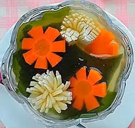 原料:嫩豆腐100g、胡蘿蔔60g、海帶芽5g、清水1000g、味噌10g