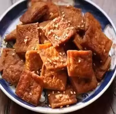 白豆腐乾一斤、糖3大匙、金蘭醬油1大匙、鹽1小匙、橄欖油適量、熟芝麻少許
