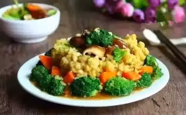 1、花菜洗凈掰成小朵2、胡蘿蔔去皮切成小一點的滾刀塊、香菇切塊。3、素蚝油里加入白糖、黑胡椒粉、澱粉。4、加水調和成碗汁。5、鍋內加水燒開下入胡蘿蔔煮一分鐘。6、下入散菜煮開。7、下入香菇煮開。8、最後下入西蘭花煮開。9、撈出過一下冷水。10、熱鍋涼油,倒入碗汁煮至開鍋。11、倒入菜翻炒均勻即可出鍋。