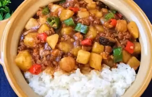 豬肉末250克,大土豆1個,香菇4個,青紅椒4個,蔥姜蒜適量。