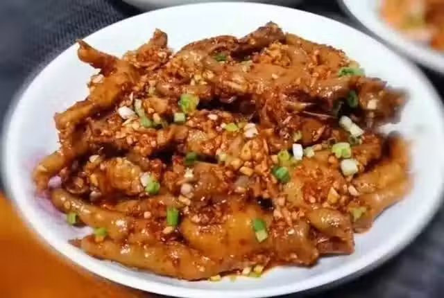 2、鍋中熱油,放一大勺辣椒,一些薑末,倒入雞爪翻炒,放一把干辣椒。