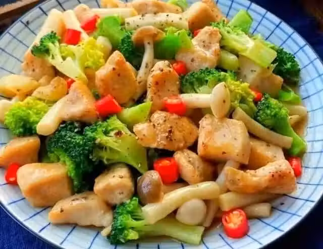 3、起鍋燒油,油熱爆香蔥姜,加入雞丁煎至金黃,加入菌菇翻炒至軟,加入焯水後的西蘭花,家一勺耗油和小米辣翻炒均勻即可。
