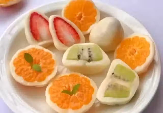 糯米粉55克,玉米澱粉20克,糖15克,純牛奶85克,黃油5克,草莓,奇異果,沙糖桔
