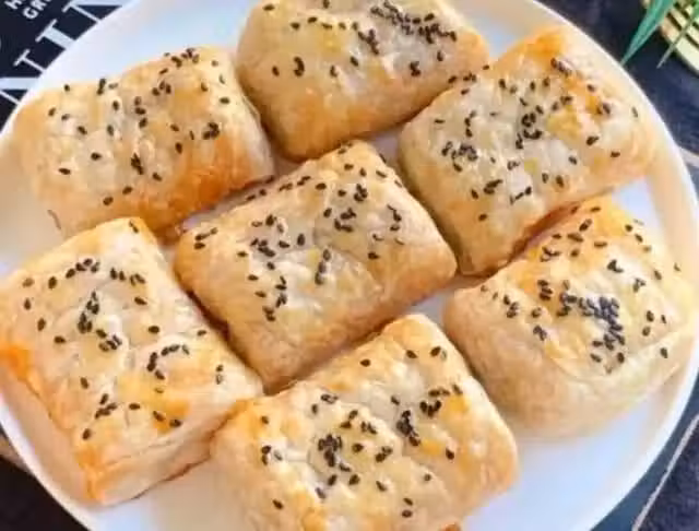 2、紅薯泥鋪在手抓餅上,捲成卷狀切塊,刷上蛋液撒上黑芝麻。