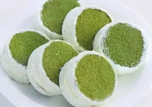 雞蛋5個,抹茶粉15克,低筋麵粉65克,椰汁60克,玉米油60克,白糖45克,冰奶酪:淡奶油150克,奶油奶酪50克,白砂糖12克。