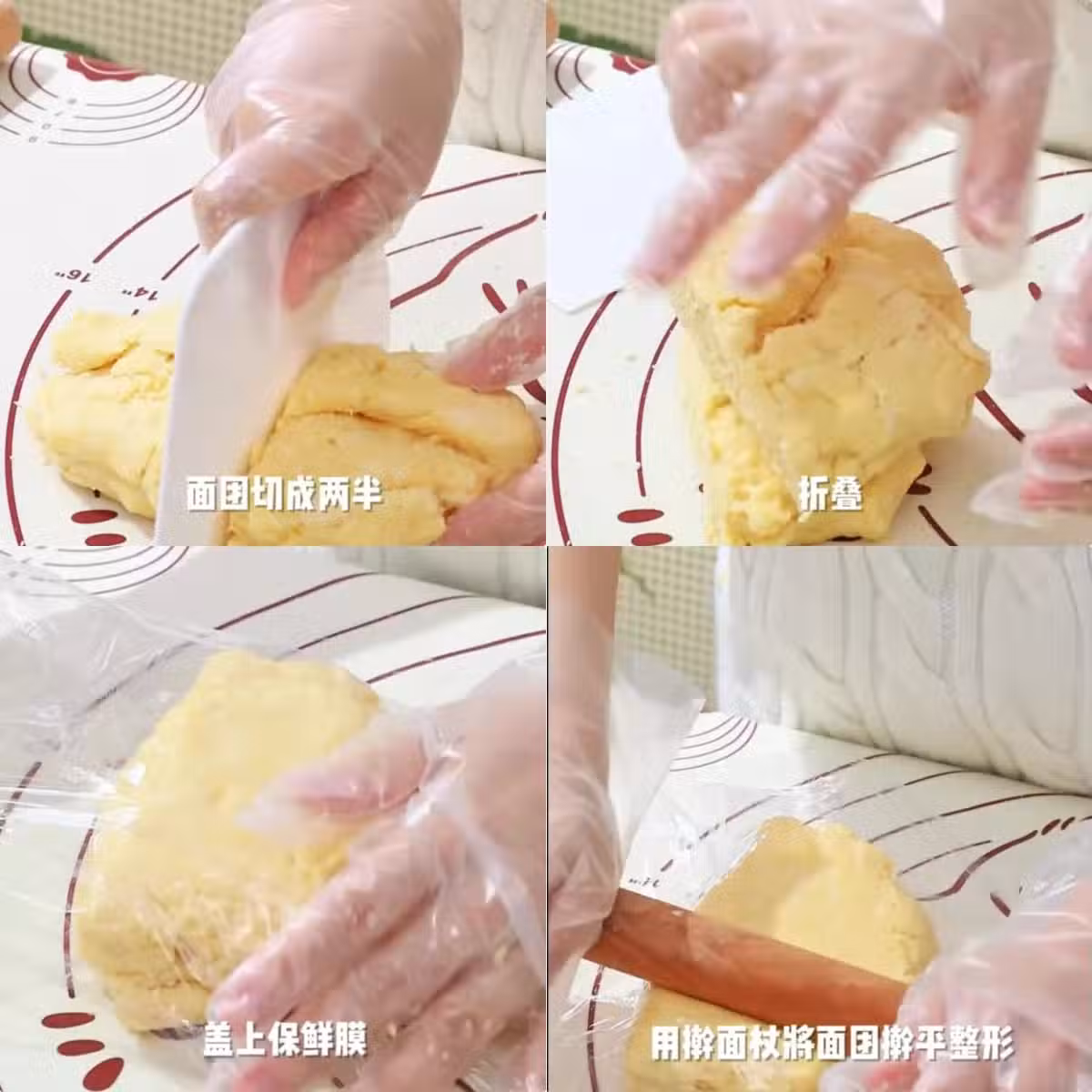 3️⃣ 麵糰切成兩半後摺疊,重複三次切兩半摺疊動作。