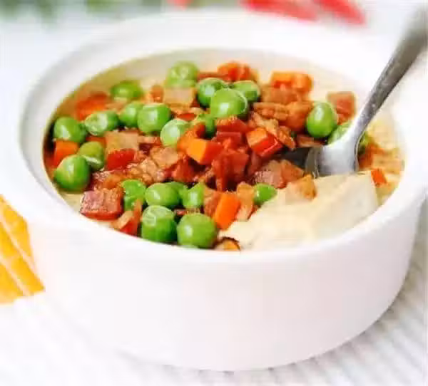 豆腐1塊,豌豆、胡蘿蔔、香菜、素香腸片各少量