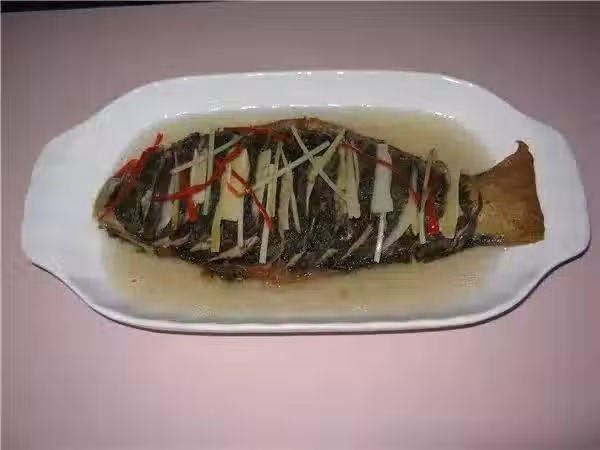 2、素魚切斜刀,過一下油,撈出空去多餘的油,在每一個斜刀口裡放一片香菇和筍片(吸收多餘的油分並釋放香味到素魚肉里),放入耐高溫的盤裡,在素魚身上放上芹菜段和薑絲;