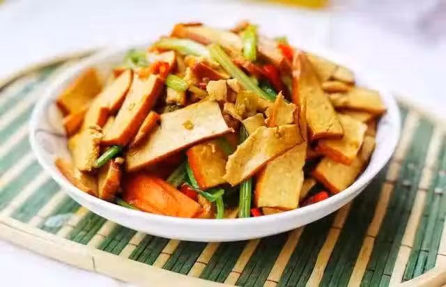 芹菜1把,香乾2片,紅辣椒3個,胡蘿蔔半根,生薑、植物油、素蚝油、鹽適量