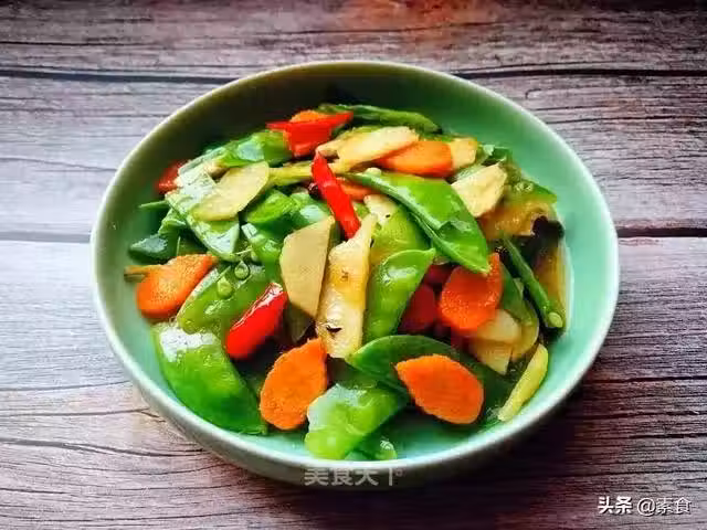 荷蘭豆適量,胡蘿蔔半根,荸薺5個,薑絲適量,辣椒3個,素蚝油、鹽適量