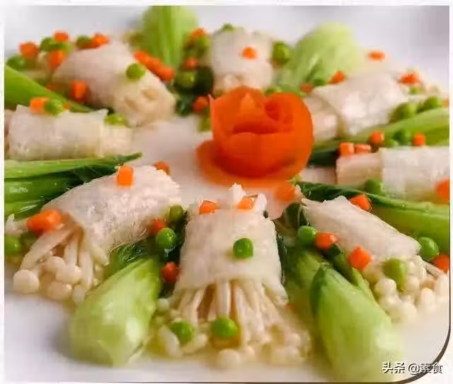 另起鍋加入一勺素上湯燒開,放入青豆、胡蘿蔔粒、調入鹽、磨菇精,勾薄芡淋上幾滴香油,出鍋澆在金針卷上即可。
