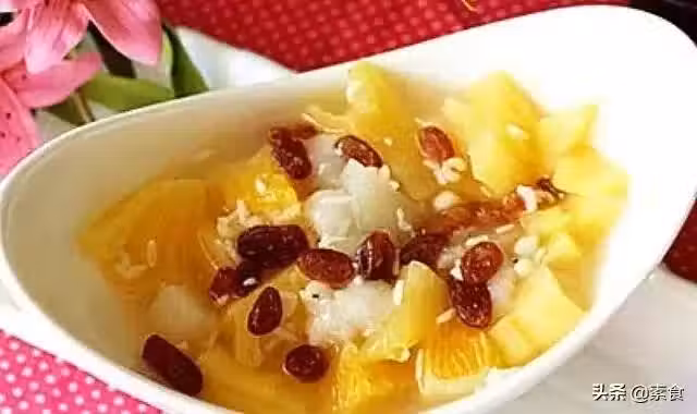 蘋果半個、橙半個、梨半個、菠蘿50克、薏米20克、葡萄乾20克。