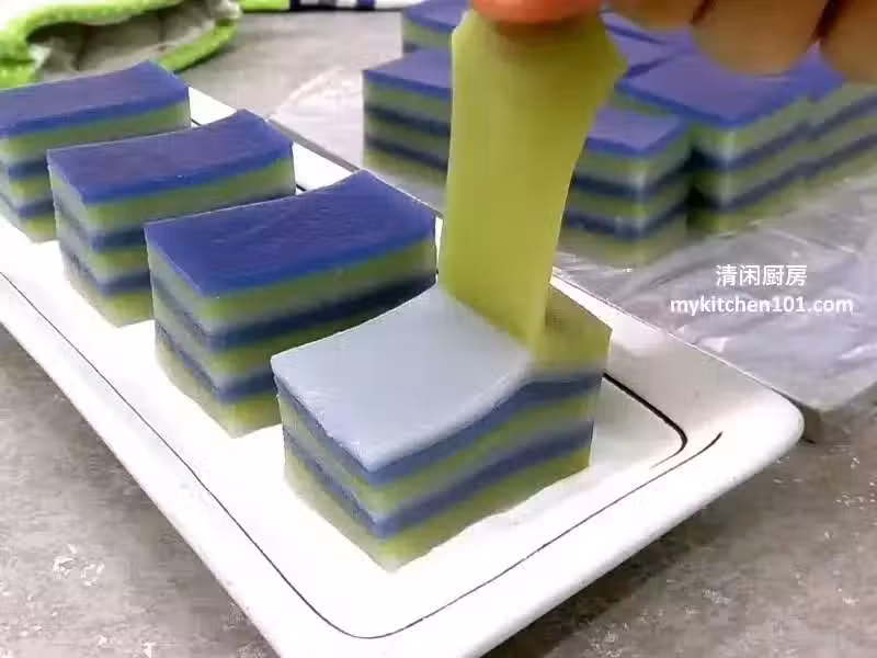 九層糕是許多小孩喜愛的糕點,最經典的吃法就是一片一片撕出來,然後放入嘴裡慢慢的咀嚼, 真好吃! 這個是娘惹式九層糕,口感帶Q,很有嚼勁。這個九層糕的顏色是取自天然色素,青色是來自香蘭葉,而藍色則是採用蘭花汁。