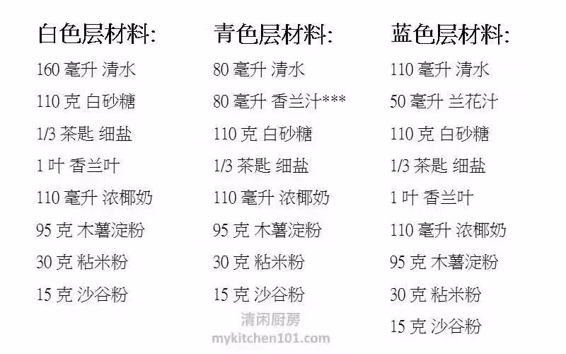 1 白色層: 把清水、糖、鹽和香蘭葉混合,加熱至糖完全融化。冷卻後,取出香蘭葉,加入椰奶和所有粉類拌勻後過篩。把白色粉漿分成3等份備用 (每份約160 克)。