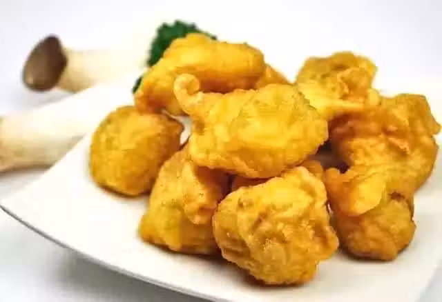 3、油燒熱,把菇塊沾麵糊下鍋大火炸熟,撈起,徹底瀝干油。