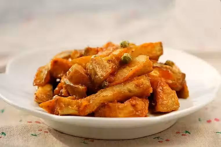 1. 將圓茄子去皮後切成細長條; 2. 加入少量的鹽腌制一下; 3. 再撒入點干澱粉攪拌均勻; 4. 茄子放入鍋中煎至兩面金黃後撈出備用; 5. 鍋中留少許油,下入番茄醬和適量的鹽和鮮蔬粉炒均勻; 6. 再放入青豆和少量的水煮開收濃; 7. 最後加入煎好的茄條翻炒均勻即可。