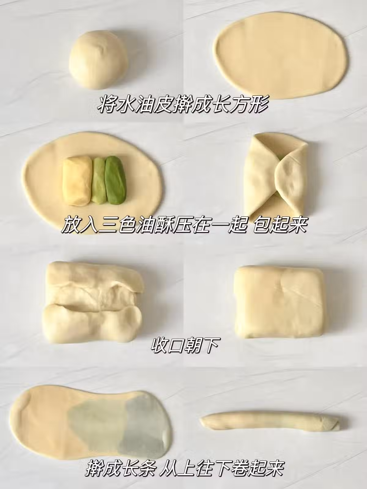 5️⃣將卷從中間往兩邊擀長至60厘米左右,從顏色深的一邊開始卷,放入冰箱冷凍15分鐘,取出從中間切開,切面朝下壓扁,擀開(確保中心點,不要擀偏了)放入餡料包起來,用刮板側面壓出小花的形狀,中間用筷子戳洞放入黃色麵糰,用牙籤扎小洞
