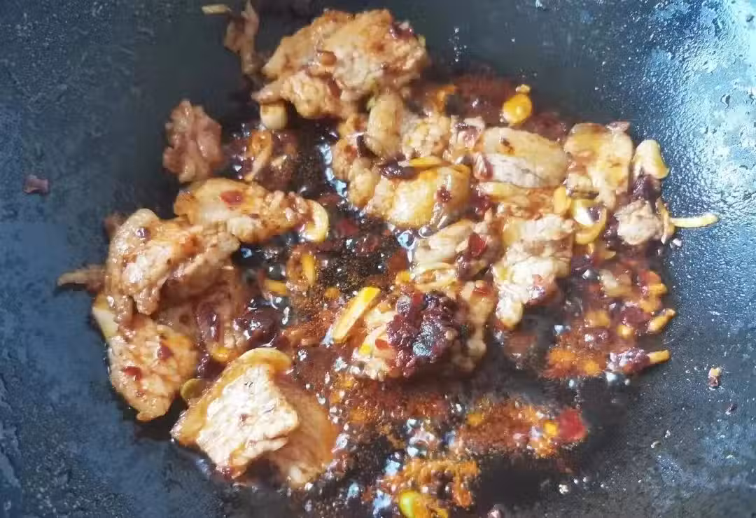 5.鍋加油燒熱,下入五花肉煎制,將五花肉煎出油,將五花肉撥至一邊,下入郫縣豆瓣醬小火炒制,炒出紅油,炒出醬香味,下入蔥花,薑末,蒜片,和肉片一起翻炒均勻。