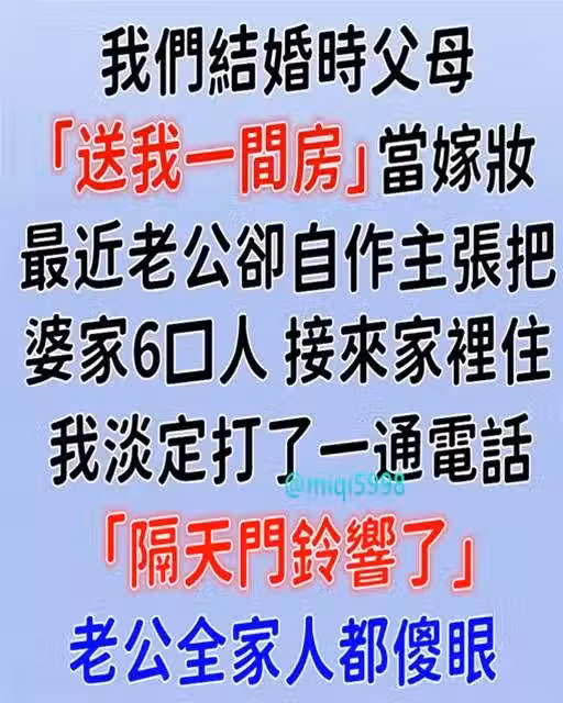 結婚時父母「送我一間房」當嫁妝,最近老公卻自作主張把「婆家6口人」接來家裡住!我淡定打了一通電話「隔天門鈴響了」老公全家傻眼…