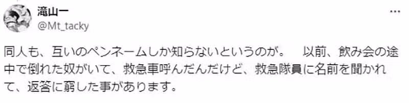「作家也一樣。彼此都只會叫筆名,甚至連自己的本名叫什麼都快忘了。在醫院被叫到本名的時候,還要想一下才驚覺是在叫自己。」