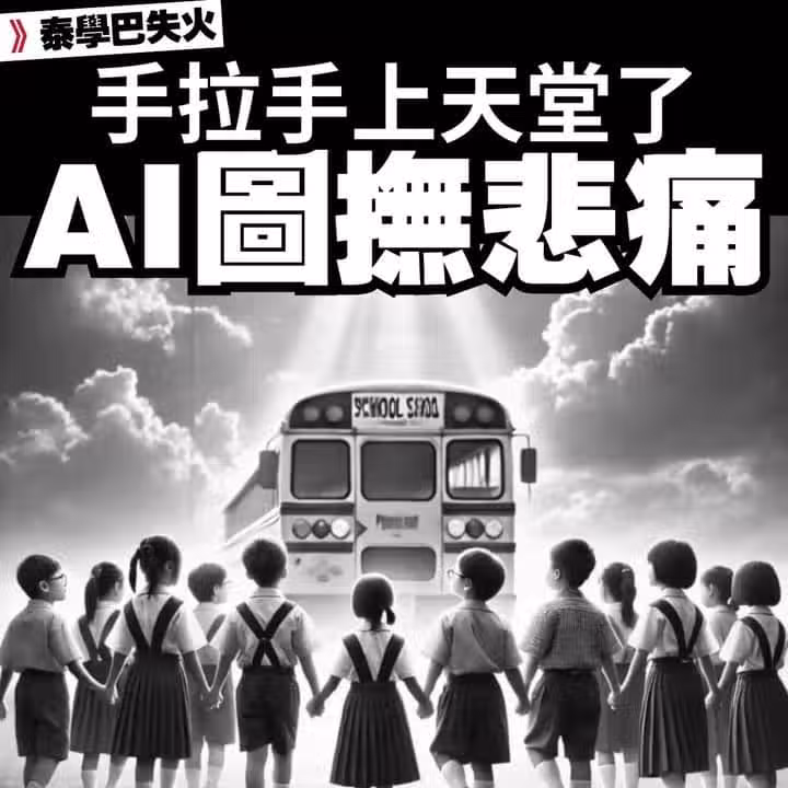 (曼谷1日訊)一輛載有44名學生和教師的巴士在曼谷郊區突然著火,造成逾25名師生活活燒死,泰國網民為了悼念被燒死的師生,利用人工智慧(AI)製圖,以安撫慰祭亡故的他們。泰國網民為了悼念被燒死的師生,利用人工智慧(AI)製圖,以安撫慰祭亡故的師生們,並安撫所有心痛的家屬及民眾。