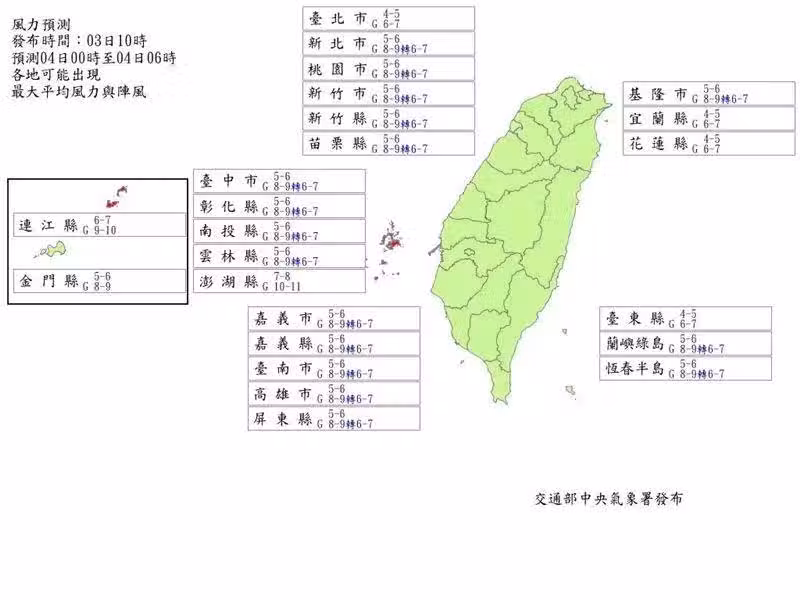 氣象署最新風力預測出爐,明日0時至6時,連江縣平均風6-7、陣風9-10;澎湖縣平均風7-8、陣風10-11達停班課標標。