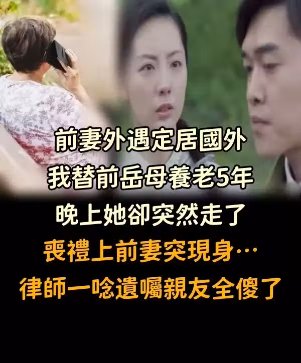 前妻外遇定居國外,我替前岳母養老5年,晚上她卻突然走了,喪禮上前妻突現身…律師一念遺囑親友全傻了…
