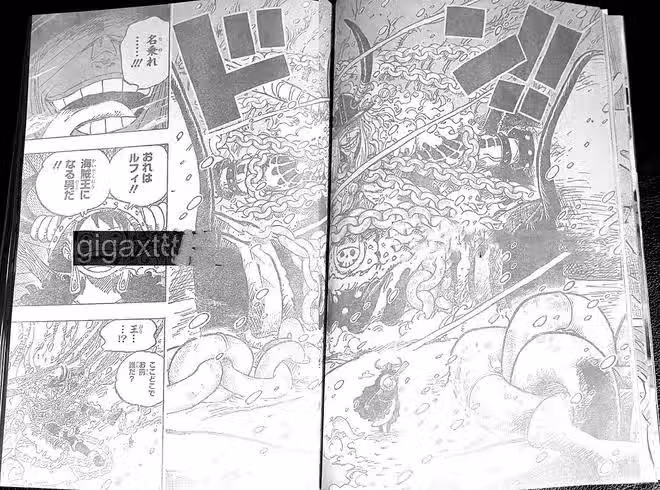 鏡頭來到了路飛這邊,被五花大綁的巨人就是王子洛基,他的廬山真面目居然是這樣樣子的?有點凱多+明哥的味道,而且還有漫威洛基那標誌性的頭盔。