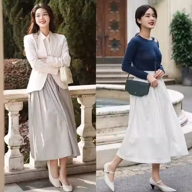 反倒是過膝蓋長度的細百褶半身長裙,穿上身的效果更加優雅體面。而且,褶皺又細又修長的半身長裙,就算是穿在普通人身上,也會顯得很有氣質。