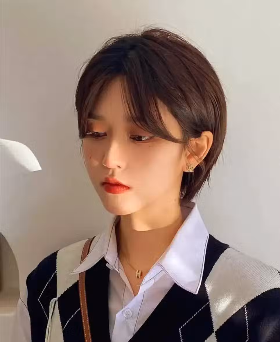 八字劉海有著特定的適用人群,顴骨外擴的人容易顯得刻薄,骨相方面的一些不足會透露出來,可以採用八字劉海,對面部的崎嶇線條進行一個著重的優化。此外,下半張臉比較大的女性,也可以試著用八字劉海體現出額頭部位的留白,從而拉長臉型,減少圓鈍感。這款八字劉海和露耳短髮的組合,更能沉澱出一種溫文爾雅的風格,搭配襯衫以及針織馬甲,很有層次。