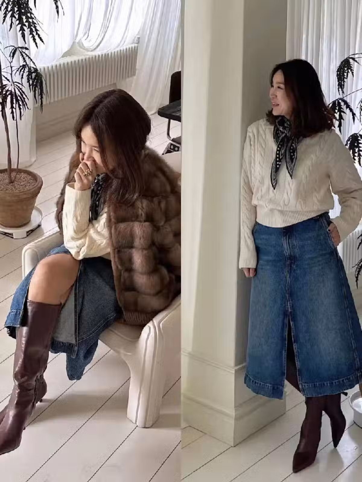 提到無齡感單品,最不能不提就是牛仔裙、牛仔褲了。中老年人可以選擇採用A版型的藍色牛仔半身長裙,配長筒靴時尚優雅又富含氣場。