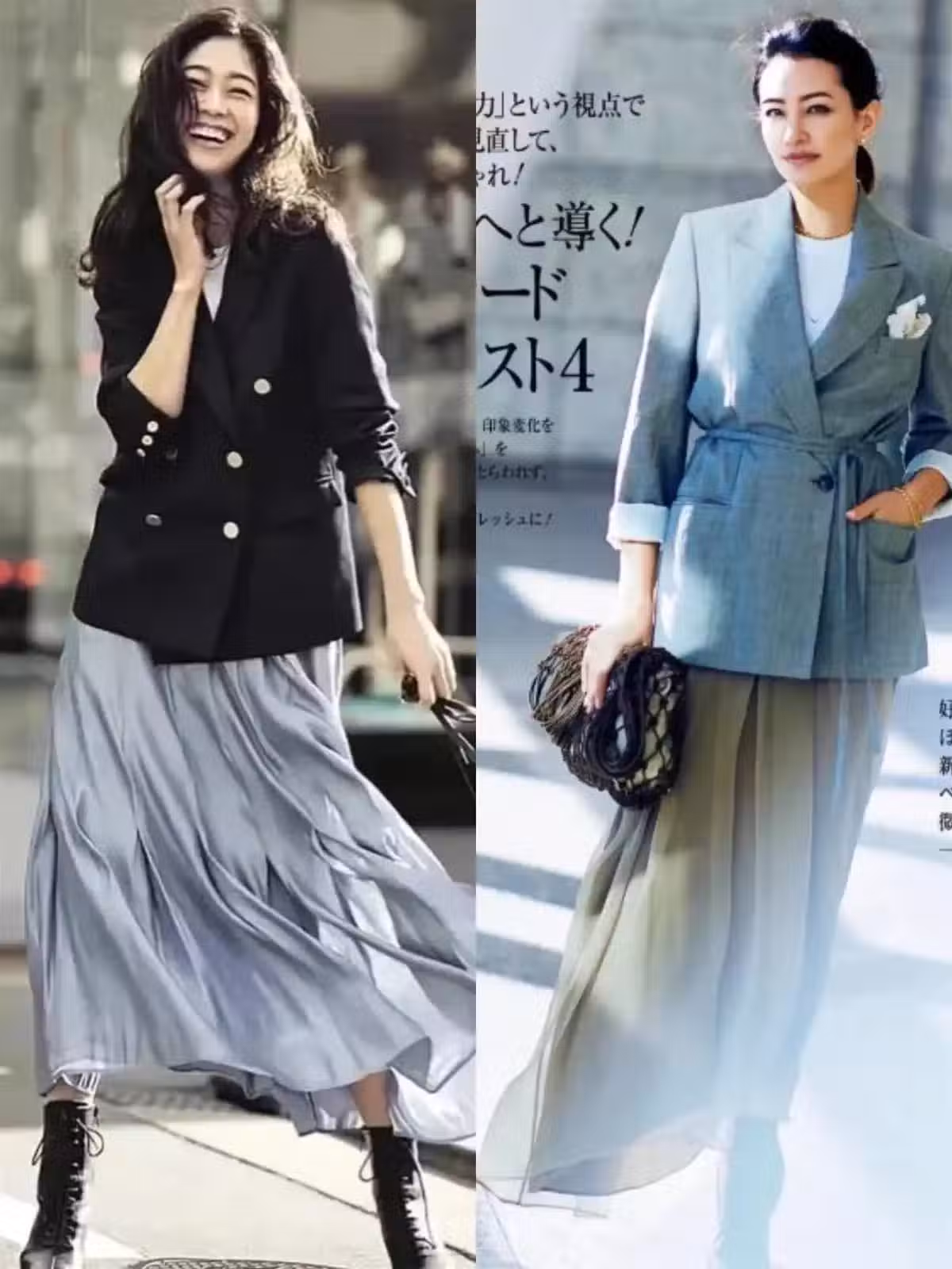 西裝外套的幹練優雅,與半身裙的浪漫飄逸,完美的融合在一起,可以呈現出更加唯美大方的造型。即便是版型挺括的西裝外套,也可以搭配唯美浪漫的半身裙。