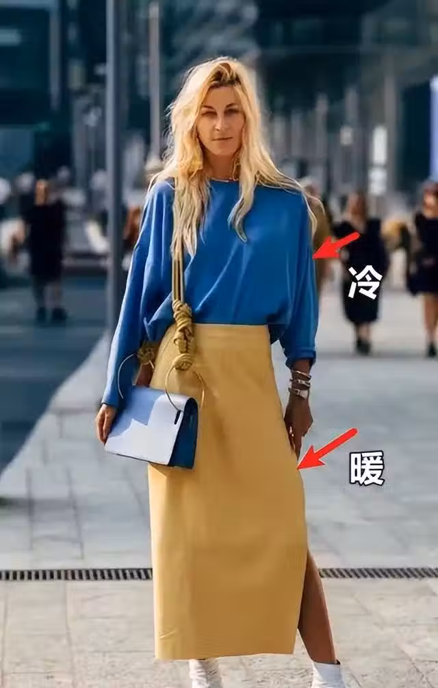 將一件深藍色的外套與一件亮黃色的內搭相結合,或選擇一條紅色的長裙搭配一件綠色的上衣,都能產生強烈的色彩對比效果。
