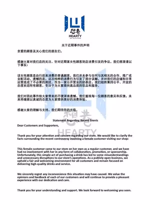文告中透露,有關事件已經對店鋪和日常運營造成了不必要的困擾;該店強調,作為一家公開營業的奶茶店,他們會專注提供優質的飲品及服務。