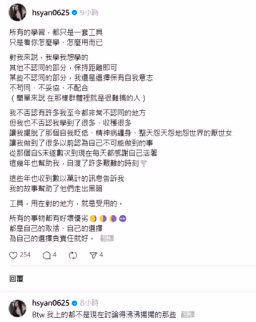 然而她坦言,儘管至今有許多自己非常不認同的地方,但她也不否認從中收穫得許多「讓我擺脫了那個自我貶低、精神病纏身、整天怨天怨地怨世界的厭世女,讓我做到了很多以前認為自己不可能做到的事,從那個自S未遂數次到現在每天都感謝自己活著,這幾年也幫助我,自渡了許多艱難的時刻」。