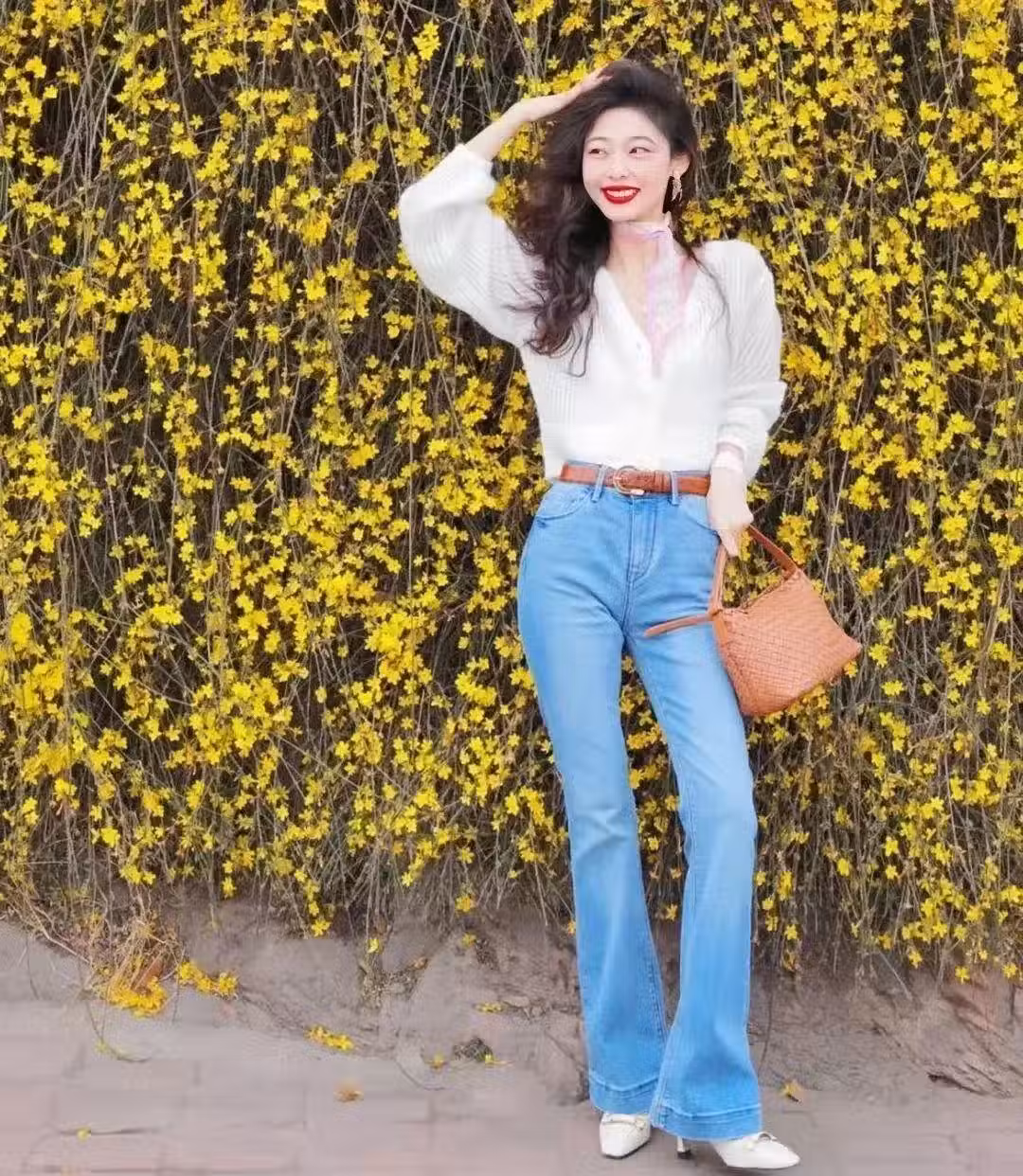 秋天穿牛仔馬蹄褲,最溫柔的搭配方式就是奶奶衫結合。自帶溫柔感的針織面料與硬朗的牛仔面料組合,給人一種剛柔並濟的感覺,脖子上佩戴絲巾彰顯浪漫的法式風情,皮帶與手提包配色呼應,細節中彰顯品位。