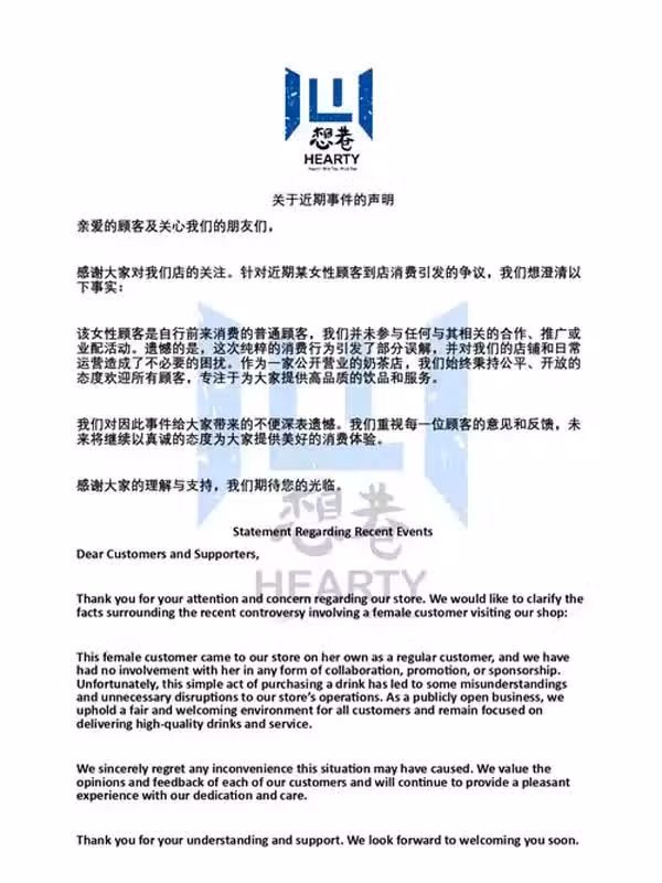 事發後,奶茶品牌「想巷」緊急發文告,強調他們並沒有跟Alice有任何的代言及合作關係,並解釋對方早前是自行到店內消費,還自稱代言人一事,已對該店造成困擾。