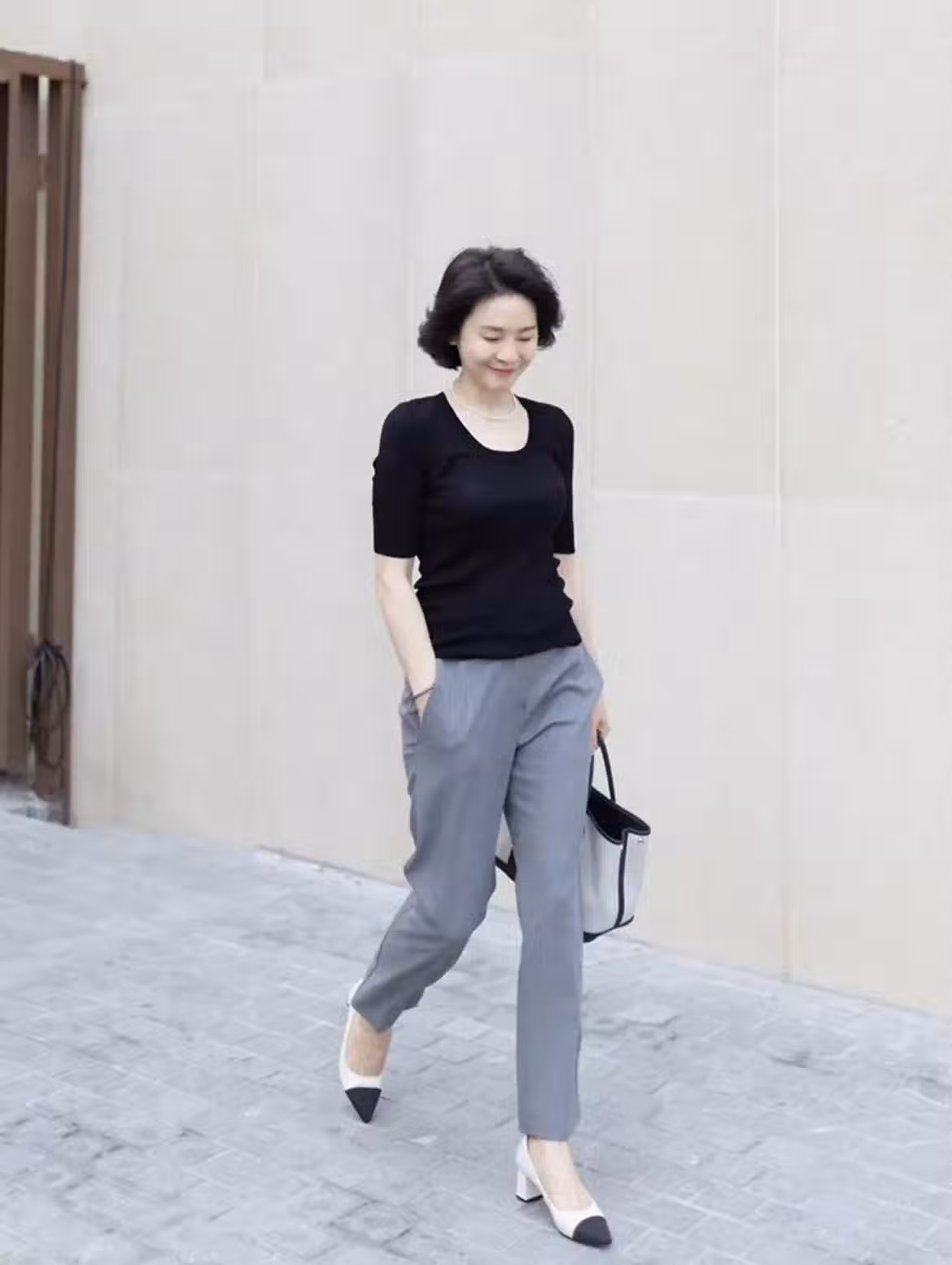 尖頭粗跟鞋是比較符合中年女性的氣質的,尖頭的設計給人一種大氣、幹練的感覺,加上粗跟的設計,不僅可以修飾腿部線條,同時也有更好的舒適度,也適合體力不足的中年女性出門穿,不容易累腳。一雙尖頭粗跟鞋足以支撐起整體造型的精緻感,但又不會喧賓奪主,是很好的選擇。