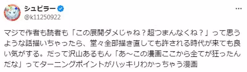 這位暱稱「シュピラー」的日本X網友,最近發文提出了一個改善漫畫業界的意見,隨即引爆熱烈議論。這個意見就是……讓漫畫家們擁有權利,能夠大大方方重畫不滿意的劇情!