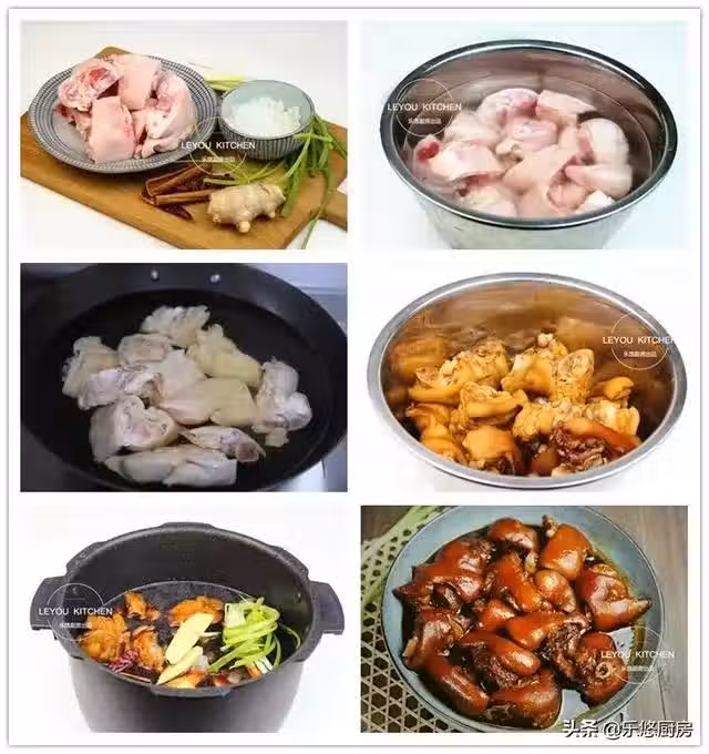第四步:趁熱往豬蹄里放入半碗老抽、半碗生抽拌勻,讓每一塊豬蹄都沾滿醬油,然後腌制半個小時。(這一步可以讓豬蹄更好的上色,也更入味。)