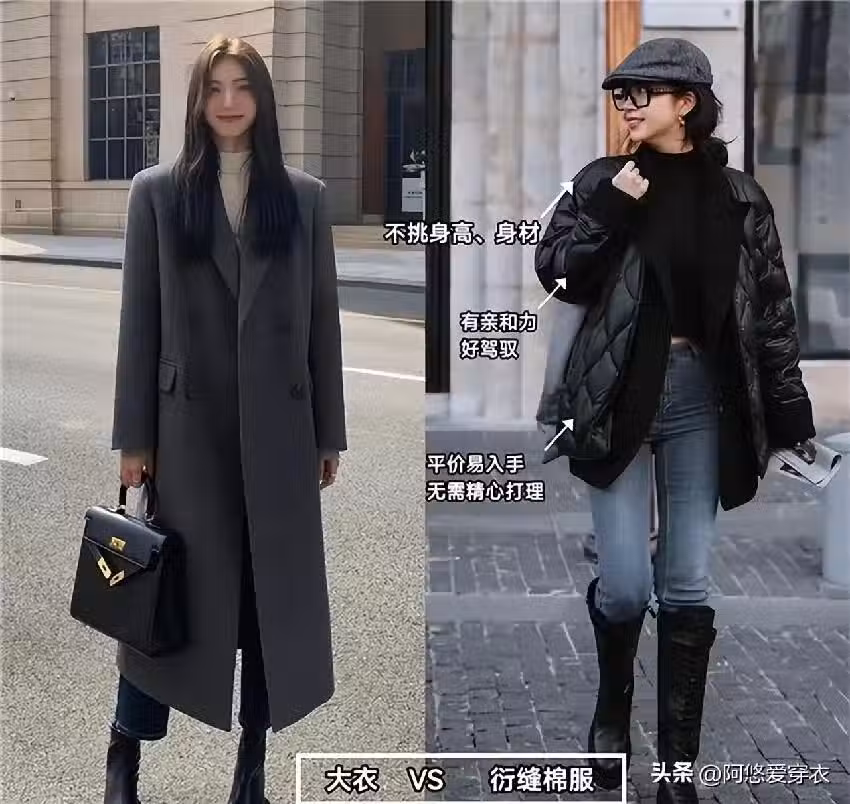 最後要介紹的「冬裝新寵」,就是曾被人嫌棄過的絎縫棉服,它今年再次回歸時尚舞台了,不同於傳統的棉服,絎縫棉服通過細密的縫線工藝,將填充物固定成一個個小格子,不僅更加保暖,還大大提升了整體的時尚感。