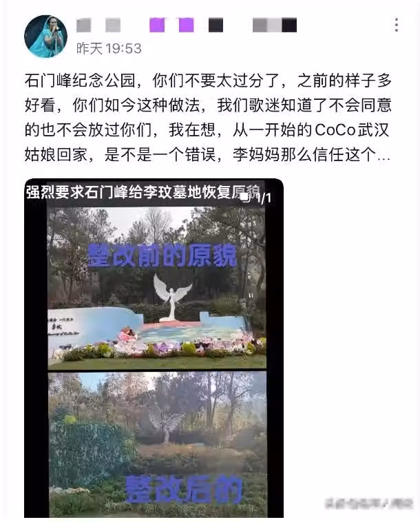 至於原因也很簡單,歌手李玟那位於武漢石門峰紀念公園的墓地,遭到了當地工作者極其讓他們作嘔地區別對待。