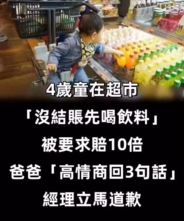 4歲小孩在商店「未付款先喝飲品」被要求賠償10倍 父親「高智商回應3句話」經理立刻致歉